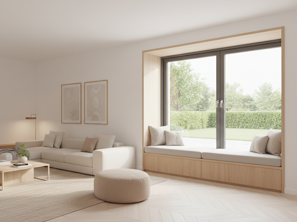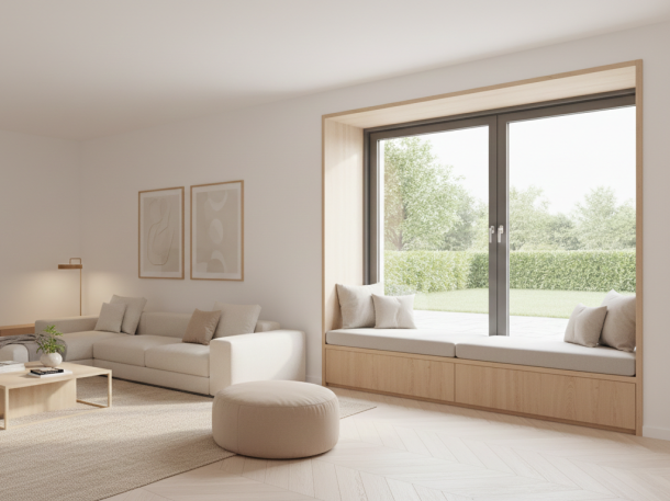 Ihr neuer Lieblingsplatz. Das Sitzfenster verwandelt den Bereich in eine gemütliche Sitzgelegenheit, die perfekt ist, um mit einer Tasse Kaffee den Blick nach draußen zu genießen oder den Kindern beim Vorlesen nah zu sein.